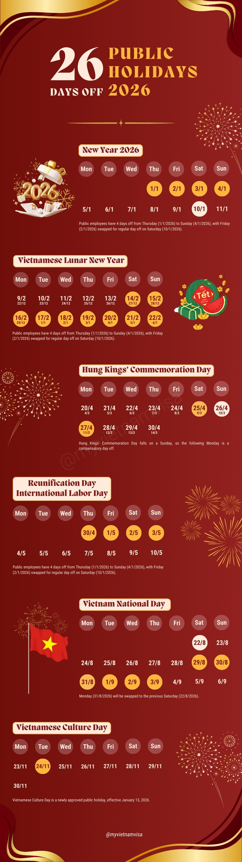 Vietnam has seven public holidays: New Year (1-4 days), Lunar New Year (7-9 days), Hung Kings’ Festival (1-3 days), Reunification Day and International Labour Day (5-7 days), National Day (3-5 days), and the newly added Vietnamese Cultural Day (1 day). In 2026, Vietnam will observe a total of 26 official public holiday days. However, the actual number of days may vary depending on how these holidays align with weekends.
